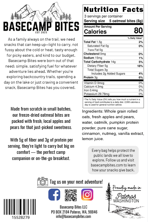 Made from scratch in small batches, our freeze-dried oatmeal bites are packed with fresh, local apples and pears for that just-picked sweetness.